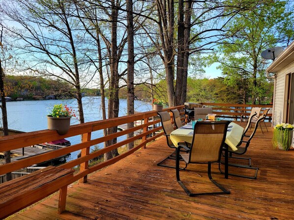 Wenn Sie dieses haustierfreundliche 3-Schlafzimmer-Haus mit 2 Bädern betreten, werden Sie sofort die atemberaubende Aussicht auf den See durch zwei Schiebe-Terrassentüren vom Ess- und Wohnbereich mit Blick auf den See bemerken, die die gesamte Vorderseite des Hauses umfassen. Diese Aussicht ist besonders bei Sonnenuntergang spektakulär. Treten Sie auf die geräumige Terrasse und atmen Sie die frische Seeluft ein, während Sie am Tisch entspannen oder eine Mahlzeit auf dem Gasgrill zubereiten.