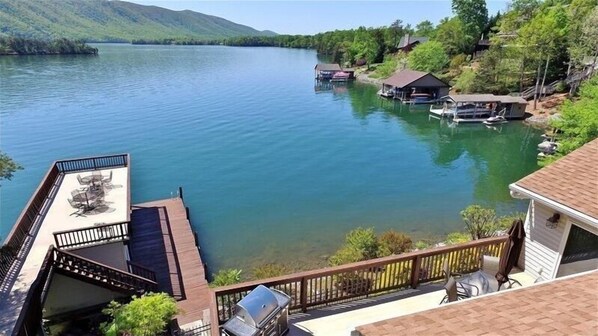 Walkway to dock extends from the lakeside deck. Party deck, covered boat slip with hoist, floating dock for boat tie-up & lockable dock house available for use. Circular, paved driveway w/inlet for boat trailer storage. Gas grill, central A/C, fenced-in roadside.