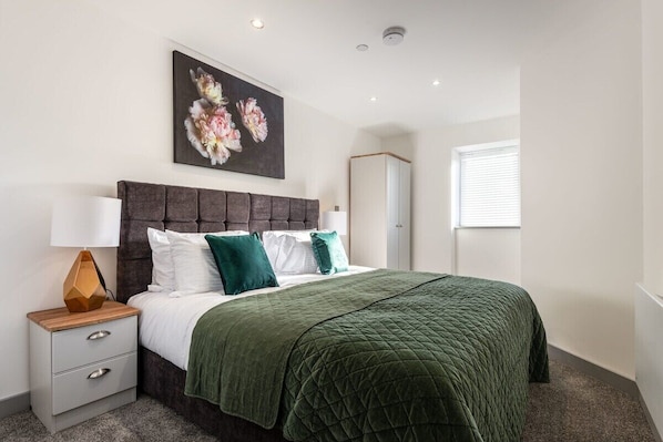This lovely spacious apartment is a comfortable home away from home and has more than enough space for up to 4 guests to live in comfort. The bright open plan living space features a fully equipped kitchen with everything you need to cook your own meals at home, dining table and a comfortable sofa and smart TV. There is high speed broadband throughout the apartment, perfect for streaming TV (e.g Netflix), and all your browsing, social media and emailing needs. There are 2 generous double bedrooms, both with plentiful storage space for clothes and comfortable double beds with crisp hotel linen. The spacious master features a large window and has a hotel-like feel. The second bedroom is a more cosy space - while lacking a window, it provides a quiet and private atmosphere for uninterrupted rest. The absence of natural light ensures a pitch-dark environment at night, ideal for those who prefer a deeper and more rejuvenating sleep. The modern family bathroom features a powerful shower and includes complimentary toiletries and fluffy towels for your use.