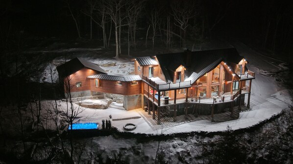 Starting in 2025, this brand-new log home will be available for occupancy. Located just seven miles from Windham Ski Resort and three miles from Hunter Ski Resort, it sits near the end of Eagles Nest Road, at the very top of the mountain. Imagine a Swiss ski lodge hidden on a sprawling 5-acre estate at the mountain's summit, surrounded by thousands of acres of pristine private wilderness. A private porte-cochère welcomes you upon arrival, providing a sense of exclusivity from the moment you step in.