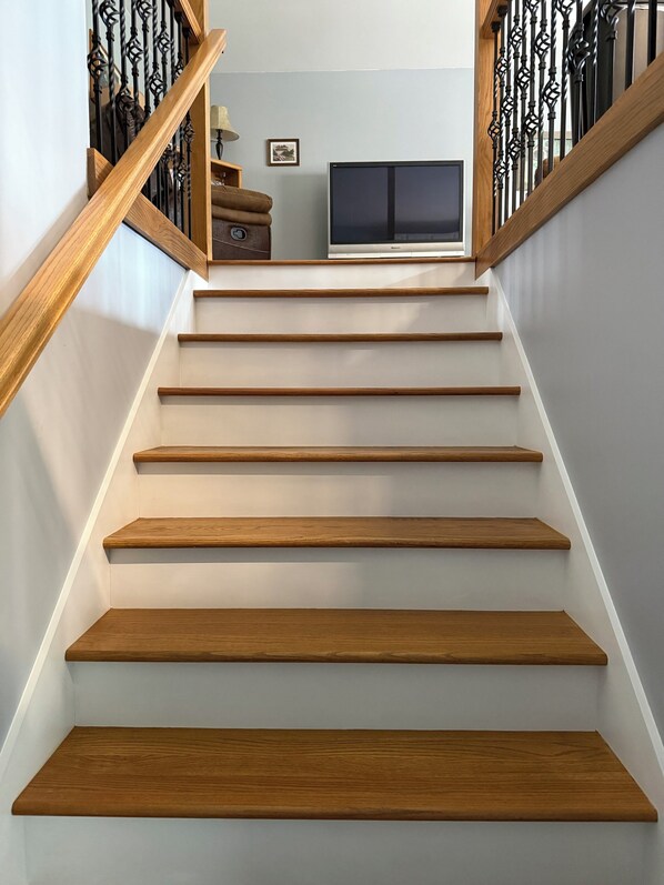 Downstairs, you will find the bathroom, a TV room, couch, and laundry area.