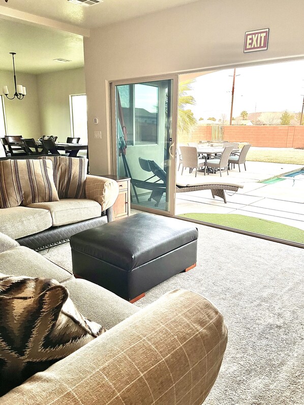 Beautiful house with plenty room for everyone. Loved the back yard as you could swim, relax in the hot tub, play putt putt golf, horse shoes, badminton or volleyball or cozy up around the firepit and enjoy the views.