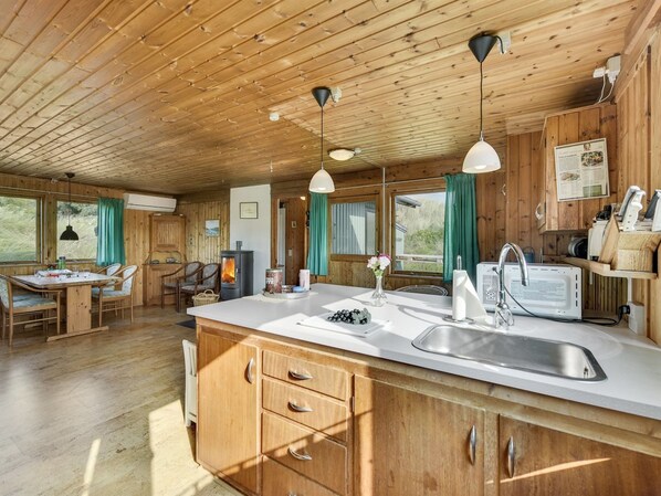 Dieses Ferienhaus in Hvide Sande bietet eine Küche und einen Kamin