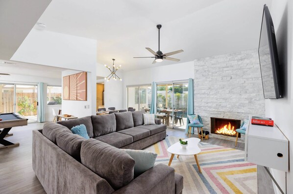 Inside the front door through the smart lock system you are greeted to a grand living space with a pool table, Pac-man arcade game, TV with streaming capabilities, and a luxurious couch. Continuing to the dining room there is a large 8 person dinner table. The kitchen is well equipped with everything you could imagine for your stay. Everything from silverware, dishware, fine cutlery, pans, baking sheets, coffee machine, Keurig, kettle, microwave, oven and stove are available. The large refrigerator and freezer have a built in ice maker and large Brita water system. Next to the kitchen there is another smaller six person table.