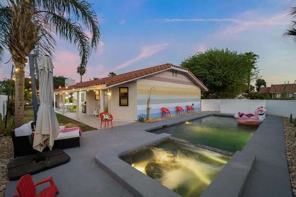 Welcome to our mid century desert Getaway. Sleep soundly in lux bedding. Play or lounge in our private salt pool and hot tub. Stargaze by the outdoor firepit area.