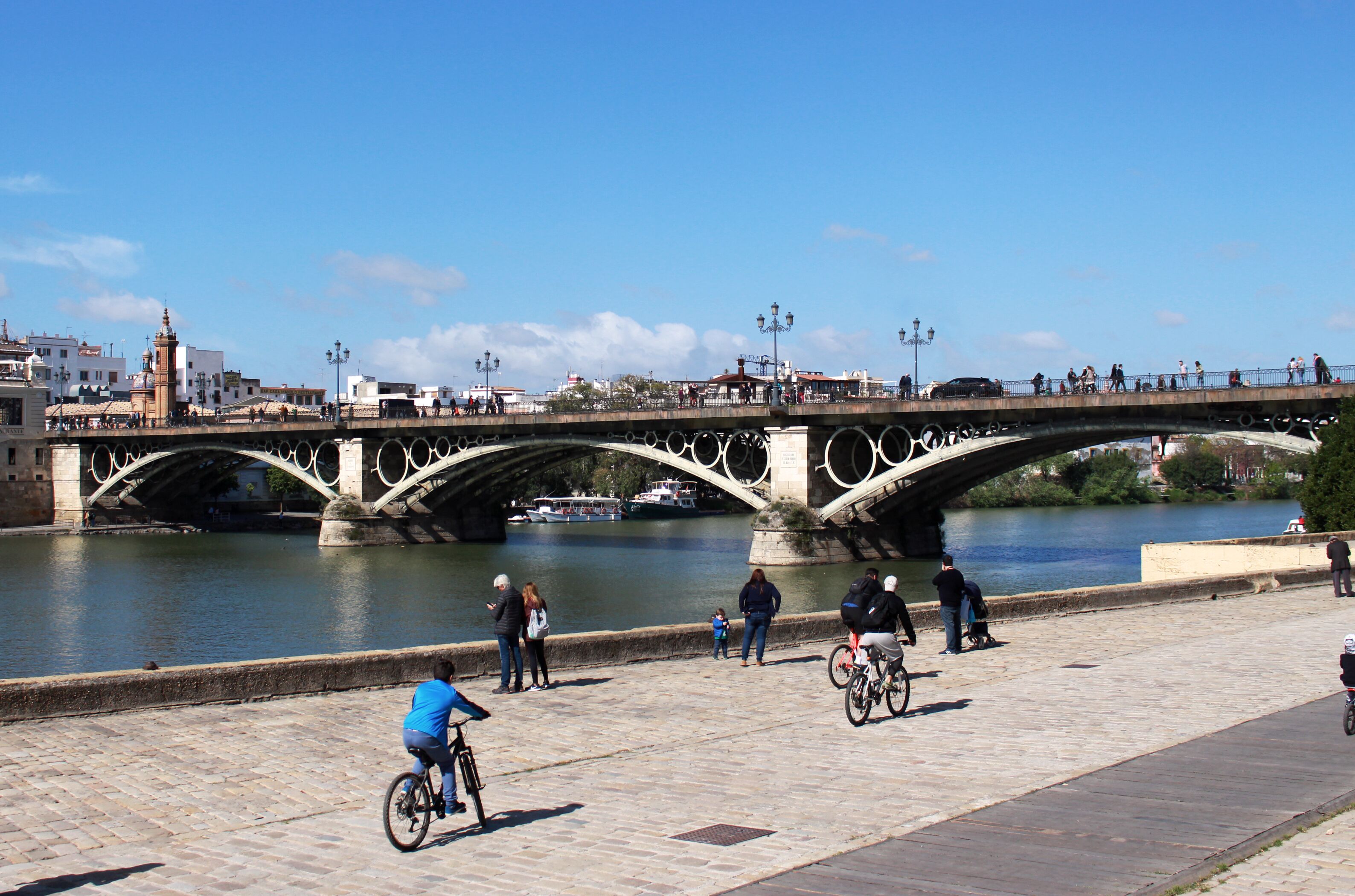 Erkunde die romantische Gegend um Insel La Cartuja – eine hübsche Flusskulisse, Shopping und Sehenswürdigkeiten von Mercado de Triana bis hin zu Triana Brücke.