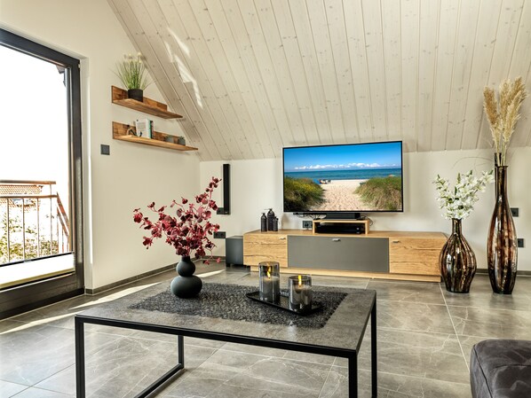 Der große Wohnbereich mit einem schönen Essplatz und Couchecke sowie TV macht Ihren Urlaub zu etwas Besonderem. Dieser Bereich lädt vor allem Familien mit Kindern zum gemeinsamen Verweilen ein. Brettspiele sind vorhanden.