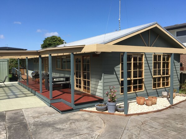 Es gibt eine Outdoor-Einstellung für 8 unter Deckung und einen Grill auf dem überdachten Deck.