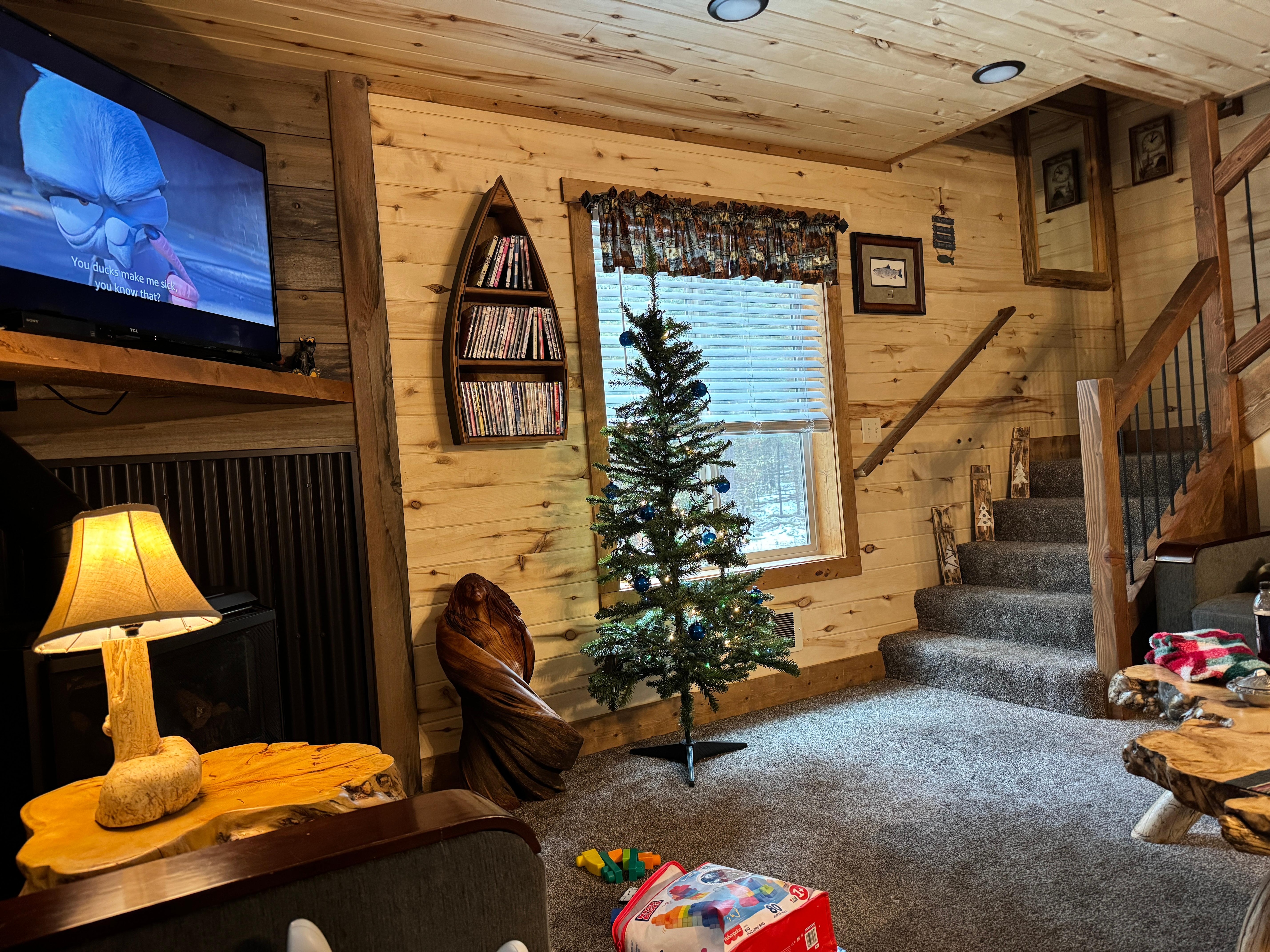 Situated at the end of a cul-de-sac the home sits on more than a half acre of heavily wooded forest backed by other old growth forest. The area provides plenty of room and direction to explore right from the cabin. There is an outdoor fire pit big enough for the whole squad to gather round for some late evening ghost stories or marshmallow roasting. We even provide the firewood for our geusts. And if you prefer to cook your meals outside youll find a gas barbeque on the back deck..