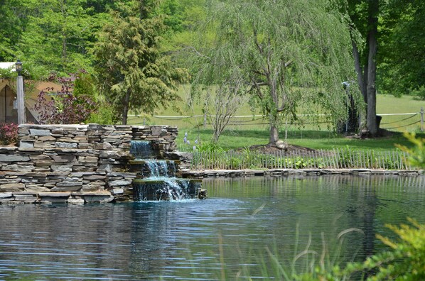 The natural pool’s beauty and tranquility is complete with a lovely waterfall and our pet Koi! The Koi are always eagerly awaiting their koi treats from our guests. These treats can be purchased for $1 from our small Mercantile store along with horse treats, rabbit treats and bird treats. The mercantile also has snacks, local wine, honey and beer along with camp cooking supplies you may have forgotten. Our fun little travelers trunk boutique has some interesting finds from our travels as well as local homemade items!