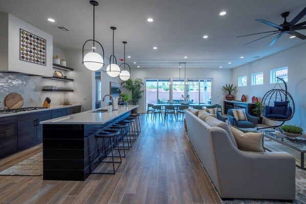 We were a large group of siblings & families traveling from all over the country to celebrate my mother in laws 75th birthday. The space was gorgeous, well appointed with high quality furniture & kitchen supplies. Each bedroom having its own en suite bathroom was amazing. Plenty of space to gather but also plenty of space for those who needed downtime. The extra fridge in each garage was also very helpful. The resort/pool area was gorgeous and well maintained. The kids spent most the days in the heated lazy river and hot tubs (February) There were so many hikes and outdoor opportunities near the resort there was something for everyone. We will definitely stay again.