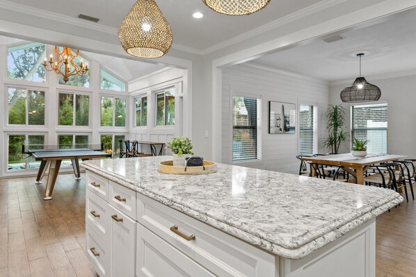 Step inside and immerse yourself in the heart of this home with open-concept living, dining, and kitchen spaces that flow together seamlessly, creating the perfect setting for family time or entertaining. Enjoy a fully stocked chef's kitchen with a bright, modern feel, oversized island, and generous prep space - ideal for entertaining, cooking family favorites, or plating up local takeout. The spacious dining table comfortably seats your whole group, making it an ideal spot for dinners or game nights full of laughter. Relax in the airy living room, flooded with natural light, designed with coastal-chic style, an oversized sofa, and a large Smart TV.
