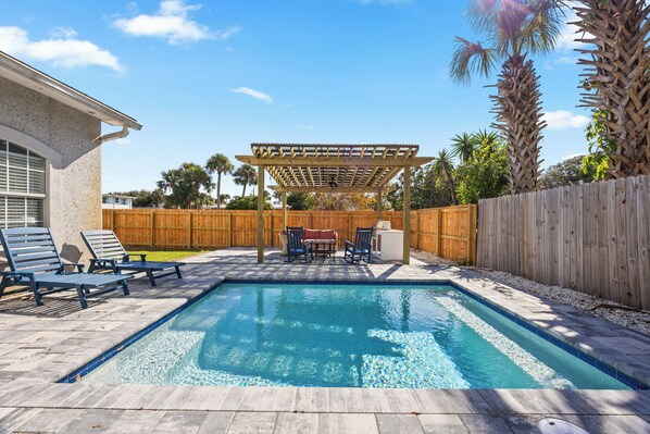 This stylish 3BR/2BA Jacksonville Beach retreat features a brand-new heated pool, a built-in outdoor kitchen with a stainless steel grill, and a screened-in patio perfect for relaxing or dining outside. Just a 5-minute stroll to the sand, beach bars, and local restaurants, this home combines modern comfort with the best of coastal living. Whether you’re grilling under the pergola, lounging by the pool, or exploring Jax Beach nightlife, your perfect beach getaway starts here!