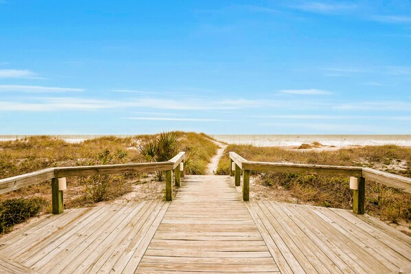 Wake up each morning to a panoramic view of the sun rising over the Atlantic at this oceanfront condo in Fernandina Beach. Enjoy direct access to the beach downstairs and a private balcony with a commanding view down the coast.