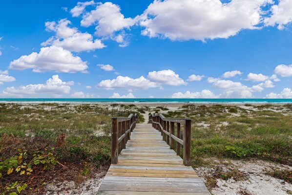 This coastal getaway is directly oceanfront and only steps from the sandy beach. A quick 2 minute stroll will take you to the huge Turtle Dunes pool where you can relax in the sun or take a refreshing dip! It's the perfect getaway for a couple, a small family, or senior citizens. While staying in this luxury vacation condo you can visit the Omni Hotel to enjoy a glass of wine, ride bicycles through the plantation's many trails, take a stroll down to the plantation's many shops and restaurants, visit the miniature golf course near the plantation entrance, or rejuvenate at the nearby spa and salon. This condo also includes access to double tennis courts and pickle ball courts just across the street.