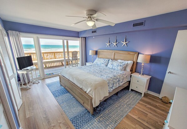 Make yourself at home in the newest oceanfront condo of best-selling North Carolina novelist Diane Chamberlain. This stunning unit offers 3 bedrooms and two full baths. Wake up to a view of the ocean from the King-sized bed in the master bedroom or enjoy sound side views from both of the other 2 bedrooms. One bedroom offers a Queen bed with sound side deck access and the other offers two Twin beds.