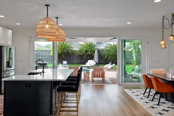 Inside, you'll find 4 bedrooms and 2.5 baths, each with unique, bold design. The open-concept kitchen, dining, and living areas are perfect for gathering, with plenty of space to cook, share meals, and relax together. Enjoy movie nights in the stylish living room, or sip coffee at the large kitchen island before heading out for a day by the beach.