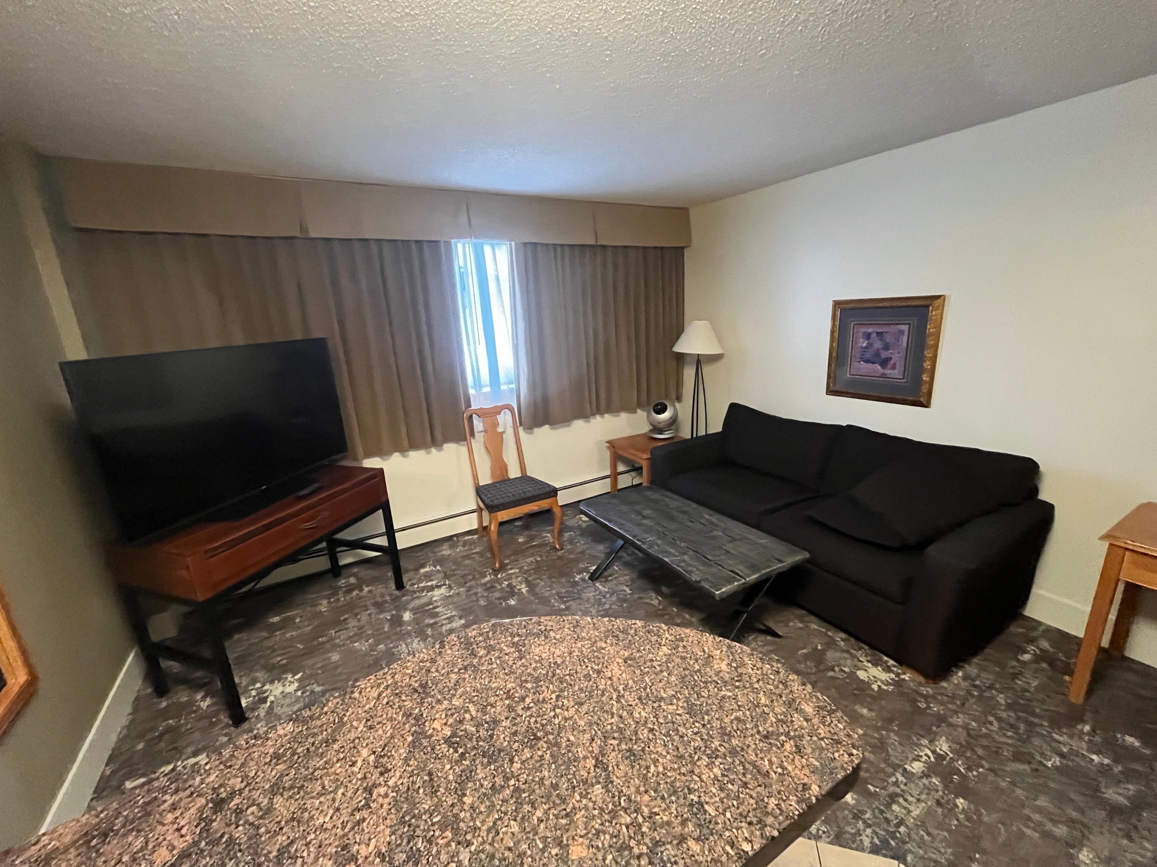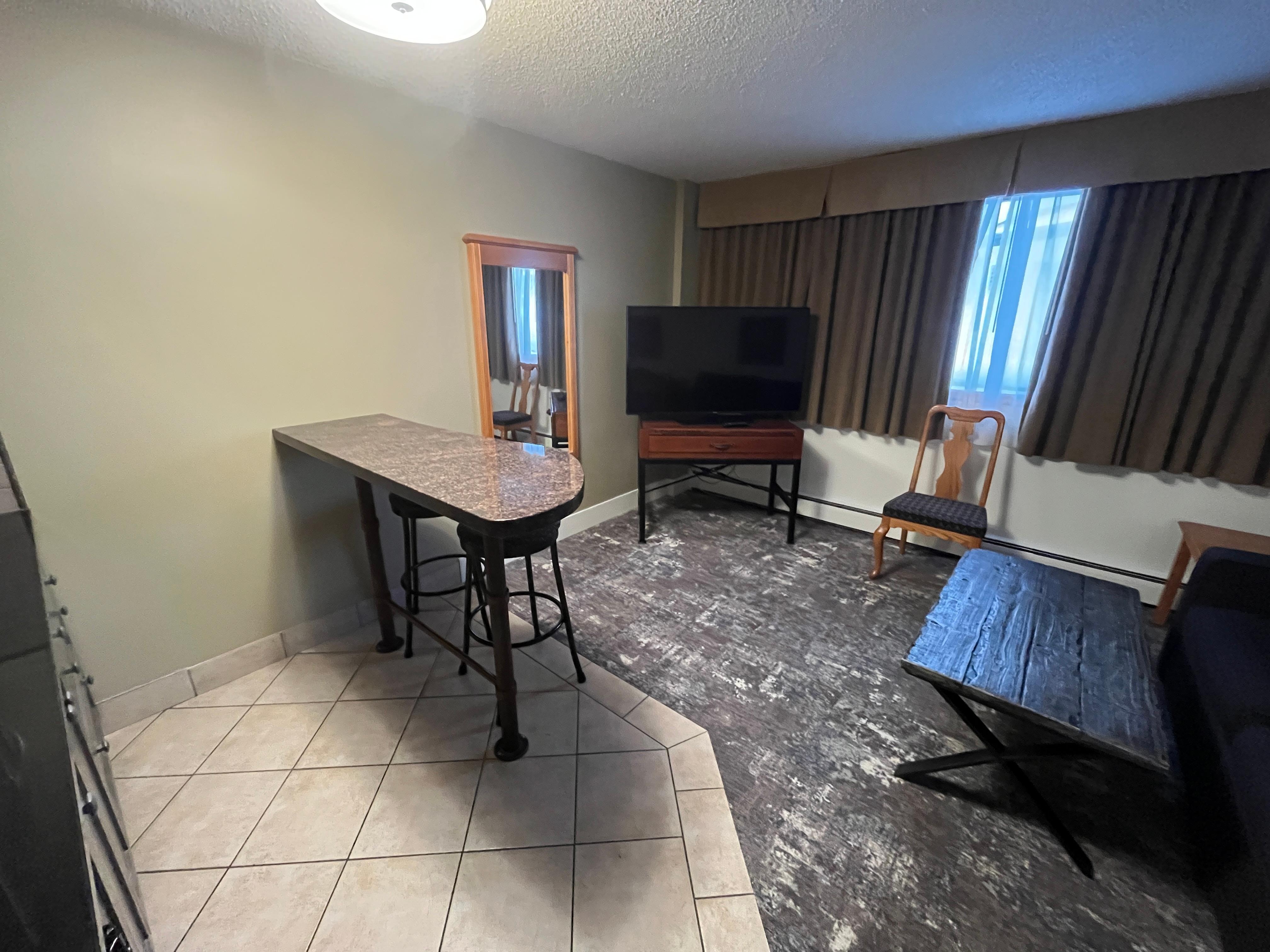 Check in was good. Poor access for disability but they had a staff member help out with luggage going down the stairs. Needs more disability parking closer to the doors, not just ONE spot. The suite turned out really nice and updated kitchen. The down fall was no air movement but did get two fans. The room temperature was cold as we were in the basement.