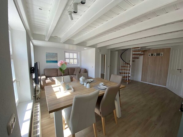 Koje 3 lädt auf gemütlichen ca. 53qm über 2 Etagen, für bis zu 5 Personen, zum verweilen ein und bietet folgende Ausstattung: Wohnzimmer mit Couch-Ecke, Flat TV, angrenzende, offene Küche (inkl. Kaffeemaschine, Wasserkocher, Spülmaschine, Mikrowelle, Toaster, Backofen) und einen gemütlichen Essplatz. In der oberen Etage, die über eine Wendeltreppe erreichbar ist, befinden sich zwei Schlafräume, einmal mit einem Bett in 1,80x2,00m und im zweiten Raum 2x 0,90x2,00m, sowie ein Funktionssofa, welches mit einem Handgriff zu einem komfortablen Bett mit Matratze umfunktioniert werden kann. Modernes Bad mit WC, Dusche & Fön Bettwäsche, Handtücher und Enreinigung sind inklusive.