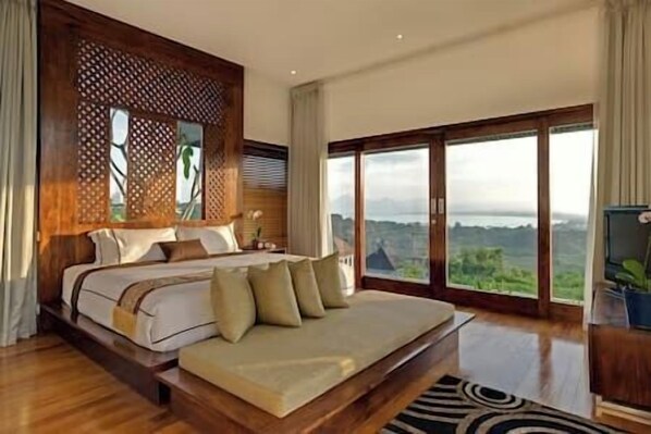 Villa Aiko is a stunningly designed contemporary villa with sweeping views over Jimbaran Bay from its prime hilltop location. East meets west as traditional Balinese features fuse deliciously with marble, granite and local woods. A profusion of glass floods the villa with sunlight and yields seamless views over manicured lawns, calming water-features and an alluring infinity-edge lap pool. The villa’s four bedrooms are spacious and private, two of them offering amazing views right from their king-size beds. Ensuite bathrooms boast chic Grohe fixtures, floors are of polished wood and entertainment facilities are top notch. A team of professional staff including villa manager, housekeepers and security staff are at your service.