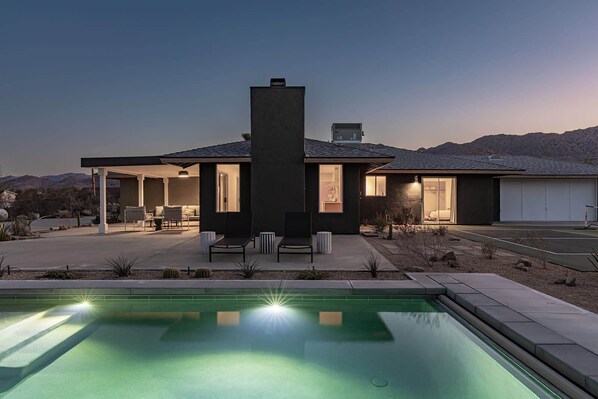 Mojave Paddle Club by Homestead Modern is a vibrant, design-forward desert retreat featuring a private pickleball court, in-ground heated pool, and spa. This expansive hideaway combines retro charm with modern comfort, offering a yoga and writing studio, wood-burning fireplace, and generous outdoor living spaces perfect for larger groups seeking relaxation, recreation, and inspiration.