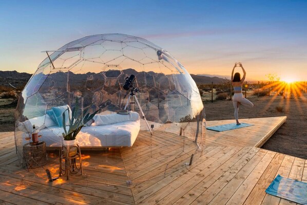 Our outdoor space has been thoughtfully designed to emphasize relaxation and privacy. The stunning desert environment invites guests to embrace the beauty of the high desert in its entirety. It offers private sanctuaries to unwind, revel in the breathtaking surroundings, and take in the panoramic views.