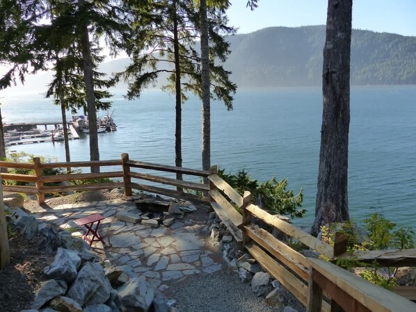 Wickham's Wake has three outdoor living areas for you to enjoy. On the upper level, enjoy a wall to wall deck with a panoramic view of the inlet, trees and ocean, all from the comfort of the adirondack chairs provided. On the lower level, a covered slate patio is perfect for your morning coffee or afternoon read. Finally, walk down the cedar tree steps to the cliff-side lower patio, which offers unequalled views and a fire pit for a night time marshmallow roast under the stars. The lower two patios are accessible from stairs outside the cottage or through the two bedrooms on the lower level.