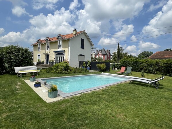 Cozy and nicely decorated maisonette, adjoining the owners'. with pool on site to share. Well located in the city center of Jurançon (all amenities on foot), 5 minutes south of Pau (Château Henri IV). Equipped kitchen area (hotplates with 2 ceramic hobs, electric oven and microwave, fridge-freezer, washing machine). Lounge area (TV, WIFI connection). Dining area opening onto terrace (awning) and garden. 2 bedrooms (1 bed 140 and 1 bed 160). Shower room/wc. Beds made for your arrival, towels included. Unheated swimming pool, salt, dimensions 3.75 m x 7.30 m flat bottom 1.50 m. Swimming hours from 10 a.m. to 12 p.m. and from 5 p.m. to 9 p.m. (from June to September depending on the weather). Bathing of children under parental supervision. Electric heating in addition (meter reading). Private enclosed garden 200 m2, private terrace under electric awning, garden furniture, barbecue. Ping-pong, badminton rackets and net. Board games. Baby equipment on request. We accept your small pet, 1 per stay (our neighbors are close, we rely on their discretion and we also have a small dog). Parking in the property (1 reserved space) in the common courtyard (gate with remote control). Billère (15 minute walk) and Artiguelouve (8 km) golf courses. Jurançon vineyards and Ossau valley to discover. 5 km from Pau, town center house (all amenities on foot) for tourist or professional stays. Vineyards of Jurançon and Vallée d'Ossau to discover.