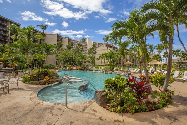 Great location close to all the fun restaurants and also close to hiking and snorkeling up by Napili. The condo has all you need for a comfortable stay. Great bed. Nice partial view of the ocean. Furniture comfortable, technology good. The resort has fun activities, restaurant/ bar has a great view for whale watching with talented musicians a couple of days a week. Nice pools. Liked being on the 3rd floor so the car was on the same level.