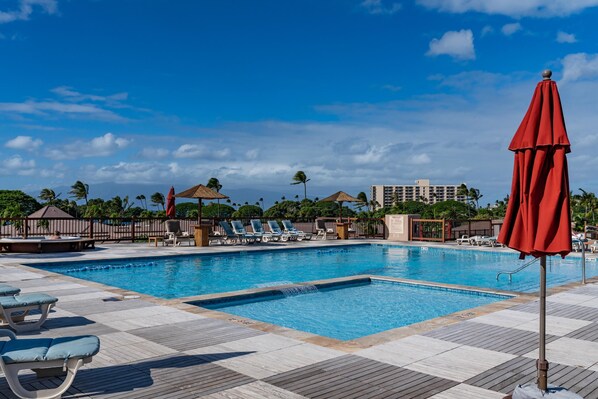 Just a short 5-minute walk or a quick golf cart shuttle ride brings you to Maui Eldorado’s exclusive beach cabana. Here, guests can access lounge chairs, towels, backrests, a full kitchen, and bathroom facilities. Prefer to stay close? The Dolphin Pool—one of three on the property—is located adjacent to C202 and features two large gas barbecues for guest use.