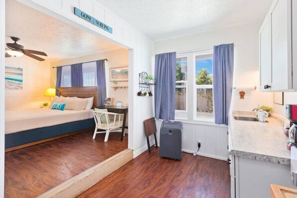 This comfy and clean Surf Studio is located 2 blocks from the beach and Ali'i drive where all the best attractions are such as tasty restaurants, fun retail shops, bars, coffee and smoothie spots, fresh farmers markets, Magic Sands Beach, and much more. This relaxing place has a peaceful and chill vibe and is centrally-located in Kona, making it the perfect place to stay if you're looking to explore this magical Big Island.