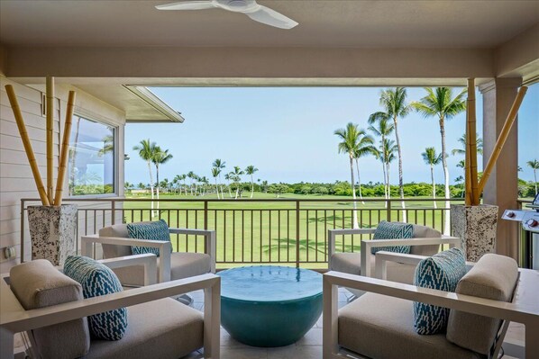 PROPERTY FEATURES • 1,800 sq ft of living space | 2 bedrooms | 2 bathrooms • Access to the Waiulu pool, spa and barbecue facilities (shared) • Fully renovated 2nd floor villa with vaulted ceilings – light, bright and modern tropical decor • Full kitchen with pro-grade appliances, side-by-side Subzero refrigerator/freezer, and new quartz counters • Ocean view lanai with propane grill overlooking 15th Fairway of Hualalai course • Flat screen televisions in great room, primary suite and guest bedroom • Two 4-passenger golf carts
