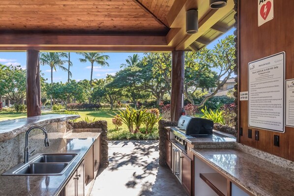* Private covered lanai with lounge seating, dining table, and outdoor BBQ