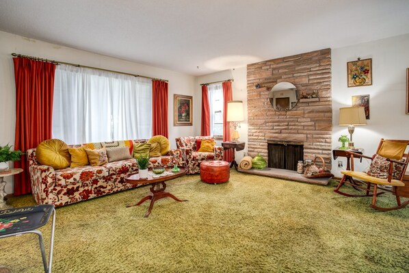 We all felt odd, as if there was someone watching us. But beyond that, address was hard to see at night, the tub was dirty, the one bed had dirty sheets, the thermostat was hard to set, there was a loud dog barking all afternoon, there was only one bath differing from listing, the 'game room' is sorely lacking a selection of games, multiple lightbulbs were missing or flashing. And the 1960's time capsule includes stinky carpets from the 60's. And if I hadn't read the reviews, I would have missed there is no T.V. which was fine by me but for the time. They could have had an old time TV with the manual knob to change channels, it would have added to the theme. There is a nice record player, but records are sparse. The history of the property and historical items were amazing. As long as yr prepared for rest. had dirty sheet under the blanket,