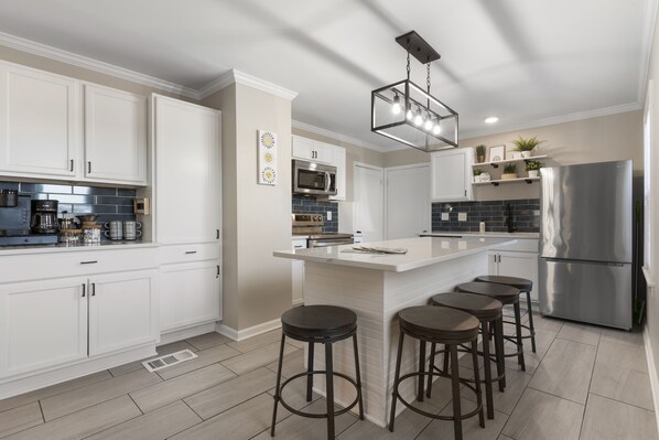 Chic, fully equipped kitchen with a stunning oversized granite island