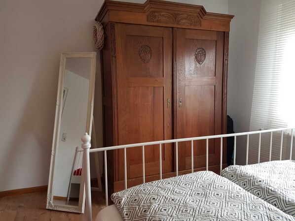 Die liebevoll eingerichtete, helle Ferienwohnung im Obergeschoss ist 100qm gross und bietet Platz für bis zu 10 Personen. Bei uns müssen Sie nicht in Stockbetten schlafen. In den 3 Schlafzimmern befinden sich insgesammt 2 Ehebetten mit getrennten Matratzen und 3 Betten mit jeweils einer grossen Matratze in den Grössen 1,60m, 1,40m und 1,20m. Im gemütlichen Wohnzimmer finden Sie einige Gesellschaftsspiele, Bücher und auch einen Fernseh. Von dort gelangen Sie direkt zur wunderschönen, zum Hof gelegenen, 25qm grossen Terrasse, auf der die Vermieter einen Elektrogrill zur Verfügung stellen. Die grosszügige Wohnküche ist komplett für Sie ausgestattet, neben den üblichen Utensilien finden Sie dort ausserdem eine Kaffeemaschine, einen Toaster, einen Backofen mit Herd, eine Spülmaschine, einen Kühlschrank und sogar eine Speisekammer. Zu der Wohnung gehört ein eigener Autostellplatz im Hof. Ein Internetanschluß ist auch vorhanden.