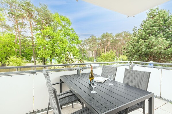 Der behagliche Wohnraum mit einer gemütlichen Sitzecke und einem Fernseher, sowie die komplett eingerichtete, offene Küche bieten einen guten Ort um sich gemeinsam in der Wohnung zu entspannen. Durch die zwei Schlafzimmer, gibt es jedoch auch einen ruhigen Rückzugsort um abzuschalten. Ein Schlafzimmer ist mit einem Doppelbett ausgestattet und eins mit zwei Einzelbetten. Das Badezimmer besitzt eine Dusche und ein WC. Auf dem Balkon können Sie gemütlich den Abend ein- und ausklingen lassen. WLAN ist vorhanden. Waschmaschine und Trockner können Sie gegen Entgelt verwenden. Natürlich stellen wir Ihnen ein PKW-Parkplatz vor dem Haus zur Verfügung. Zum feinsandigen, weißen Badestrand sind es nur ca. 3-4 Gehminuten.