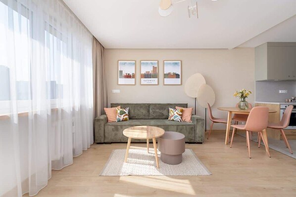 Dieses 37 m² große, moderne Appartement ist ideal für eine Geschäftsreise, einen Wochenendausflug oder einen Familienaufenthalt. Es besteht aus einem Wohnzimmer mit Kochnische, einem komfortablen Schlafzimmer, einem Badezimmer und einem Balkon. Der klimatisierte Hauptraum verfügt über ein bequemes Schlafsofa, einen Fernseher zur Unterhaltung, einen Tisch mit vier Sitzplätzen für gemeinsame Mahlzeiten und einen Schreibtisch, der sich ideal für die Arbeit im Büro eignet. Die Küchenzeile ist mit einem Backofen, einem Induktionskochfeld und einer Mikrowelle für die Zubereitung hausgemachter Mahlzeiten gut ausgestattet. Das Schlafzimmer ist mit einem bequemen Doppelbett ausgestattet, so dass die Wohnung ideal für 4 Personen ist. Das helle, kompakte Badezimmer verfügt über eine Dusche und ein WC. Außerdem gibt es eine Waschmaschine im Flur, die bei längeren Aufenthalten nützlich ist. Diese freundliche und komfortable Wohnung wird auch die Erwartungen der anspruchsvollsten Gäste erfüllen. Für einen guten Start in den Aufenthalt stellen wir unseren Gästen kostenlose Toilettenartikel, Handtücher und Bettwäsche zur Verfügung.