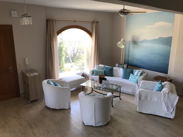 Luxurious Villa with 4 double bedrooms, 4 bathrooms (2 ensuite), large indoors and outdoors entertainment spaces, open modern kitchen, large indoors outdoors dinning area, airconditioned, with a designer's private pool and an Olympic size lighted double tennis court all in an acre of olive trees, with a treehouse, own stream and sea views.