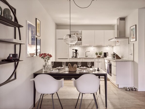 Die voll ausgestattete Küche lädt zum gemeinsamen Kochen ein. Im offenen Wohn- und Essbereich finden sie einen Esstisch mit zwei Stühlen und einer bequemen Sitzbank.