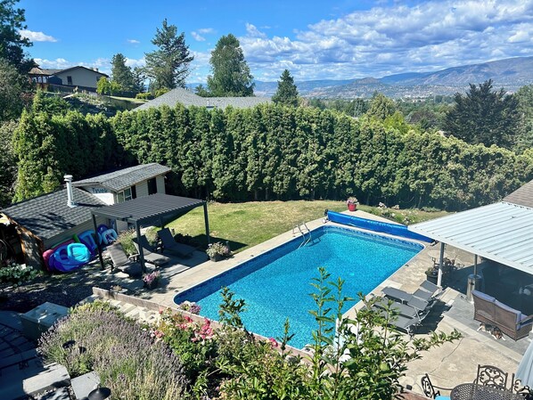 Enjoy a resort-style backyard with a heated saltwater pool, hot tub, and scenic views—perfect for unforgettable stays with family and friends. Minutes from Kelowna’s top wineries, golf courses, beaches and down town.