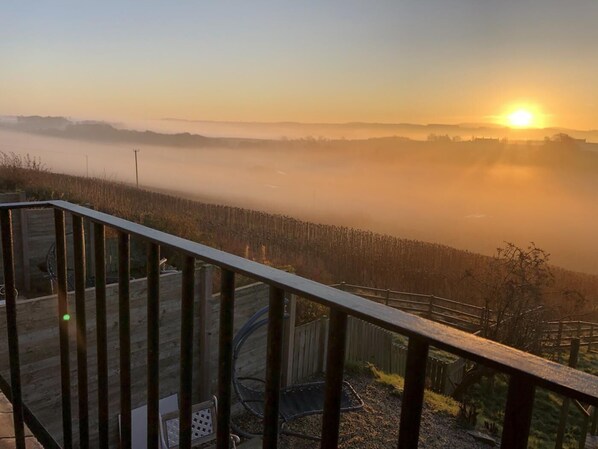 Outside: Sheltered south facing patio with breath taking views, recliners, garden furniture, charcoal barbecue. A lower garden with a grassy patch for sunbathing and picnics. Shared tennis court.
