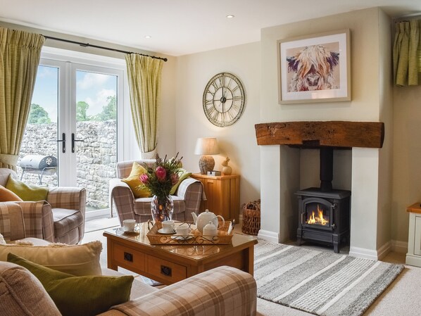 Living/dining room: Freeview Smart TV, DVD Player, Gas Woodburner, French Doors Leading To Patio