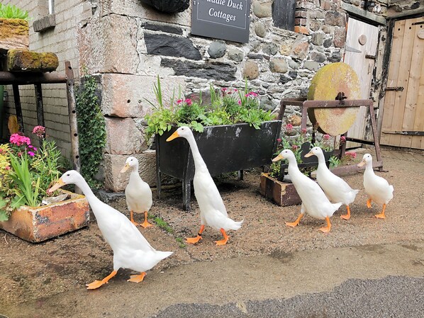 Situated on a former sheep farm, the property is in the courtyard next to the owner’s farmhouse and 2 other cottages where chickens sometimes wander and enjoy being fed. Guests often enjoy watching the comical antics of the puddle ducks on the nearby stream, or just relaxing with a book or drink and watching the world go by.