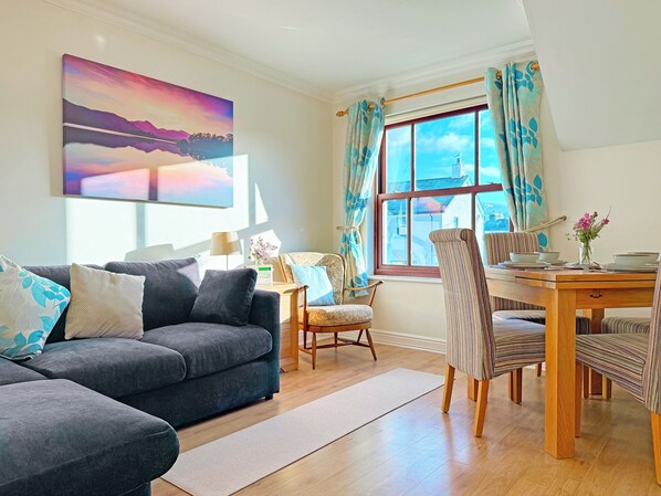 Badezimmer: Mit Dusche über der Badewanne und Toilette. Elektrische Zentralheizung, Strom, Bettwäsche, Handtücher und WLAN inklusive. Willkommenspaket.. Privater Parkplatz für 1 Auto. Rauchen verboten.. Das Hindscarth ist ein Apartment im zweiten Stock, das im Mai 2018 komplett renoviert und neu eingerichtet wurde. Es ist hell und luftig und geschmackvoll eingerichtet und bietet einen schönen Blick über die Stadt bis zu den Hügeln in der Ferne. Die Wohnung strahlt Ruhe und Gelassenheit aus - vielleicht wegen der Aussicht. Das Hindscarth liegt direkt an der Hauptstraße und nur wenige Gehminuten vom Stadtzentrum mit zahlreichen Restaurants, Teestuben, Pubs und Geschäften entfernt. Was kann man sich mehr wünschen als einen Privatparkplatz in dieser geschäftigen und florierenden Seestadt?