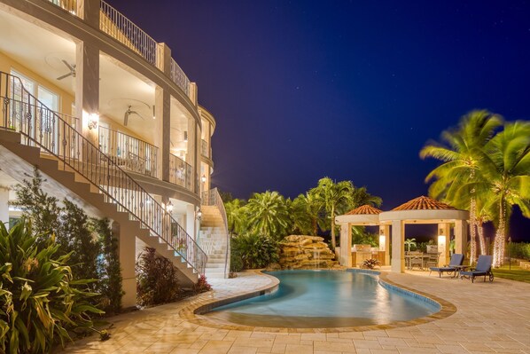 With five full, high‑end designer bathrooms, every guest enjoys ultimate comfort and privacy. The open‑concept main living area includes a gourmet chef’s kitchen equipped with stainless steel appliances, granite countertops, a large island with seating, and everything needed to create unforgettable meals. Step outside to your freshwater private pool, framed by swaying coconut palms, setting the scene for pure relaxation and entertainment. Additional resort‑style amenities include a private dock ideal for boating and fishing, a dedicated Billiards Room for friendly competition, and a full Pickleball court for active fun.