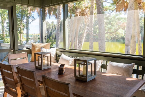 1010 Thrasher Ct, lovingly known as The Surf Shack, is a charming cottage situated in one of the best locations on the Island and is a favorite spot to many vacationers. The cottage has been completely renovated down to the studs and re-designed by the homeowner to take advantage of the view (partial ocean view from the porch plus situated on a lush lagoon), the cottage is the culmination of worldly travels so no matter where you are from you will feel right at home here! Watch the shrimp boats trolling the coast from the outdoor dining table while enjoying your morning coffee or an evening sunset cocktail. It has 180 degree views of the lagoon as well which has an abundance of wildlife. It is located in the popular Sparrow Pond community and close to all of Kiawah's amenities as well as Freshfields Village. Easily walk to the pool and beach, the access is nearby! This gorgeous cottage offers upscale furnishings with all white floors, shiplap walls, and a great outdoor space with outdoor kitchen. The owner has added some nice touches such as the custom ping pong table outside as well as two outdoor showers. It also boasts newly renovated kitchen and baths, Wi-Fi internet, and top of the line appliances throughout. There are four bedrooms with plenty of room, and 4 bathrooms that all have had a full renovation and have a spa like feel. Full sized washer and dryer.