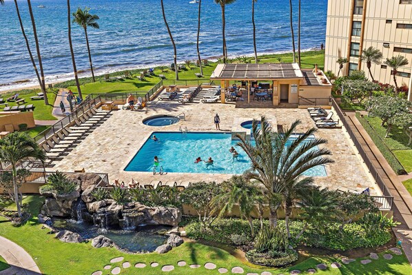 SB#504 is a one-bedroom, one-bath beachfront condo on the 5th floor, with ocean and pool views, as well as views of the West Maui mountains. It sleeps up to four people***, with a king bed in the bedroom and a sofa bed in the living room.