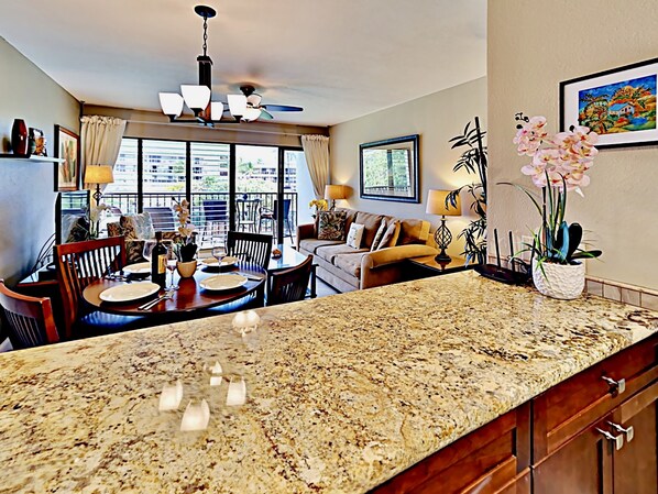 Kommen Sie in unser Kihei Akahi-Juwel! Unsere wunderschöne, komplett renovierte Wohnung befindet sich im 4. Stock und ist ruhig und ruhig. Sie werden den frischen, offenen und luftigen Grundriss dieser Einheit lieben, die durchgehend gefliest und mit geschmackvollem hawaiianischem Dekor verziert ist.