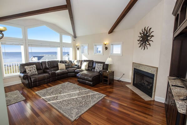 Top Level: Great room with a 75" smart TV with free Netflix, gas fireplace and deck access. Kitchen with 6-burner Viking gas stove with flat top, full-size freezer and breakfast bar seating for 4. Dining area seating 8, half bath and the 6th Bedroom with Queen Sleep Sofa, smart TV and private deck access.
